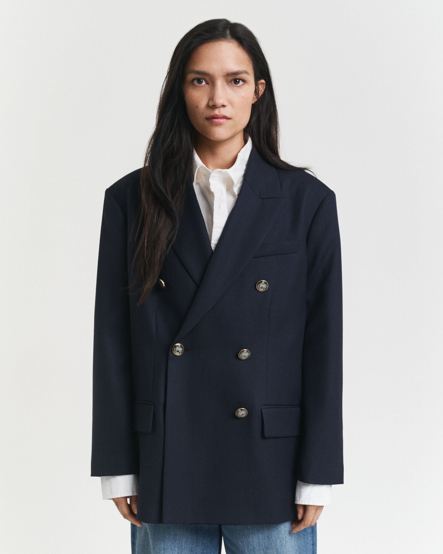 This piece is part of our premium capsule collection: 240 Mulberry Street. The capsule honors our heritage as pioneers of American Sportswear by taking preppy classics and evolving them into new silhouettes made from the finest fabrics. Expertly tailored and timeless, this blazer is lined in certified viscose and crafted using Italian wool with a hopsack weave. We've designed this piece oversized with peak lapels, a double-breasted front and lightly padded shoulders to enhance the fit. This blazer features lower jet pockets and a single chest welt pocket at the front, plus multiple interior pockets. Other design elements include double vents at the back, sleeve vents with fabric-covered buttons, felt under the collar, and branded enamel-filled shank buttons affixed at the front. This blazer is complete with a woven label at the sleeve which can be easily unpicked and removed from the garment based on your personal preference. This garment is intended for an oversized fit. For a closer fit, we recommend sizing down.